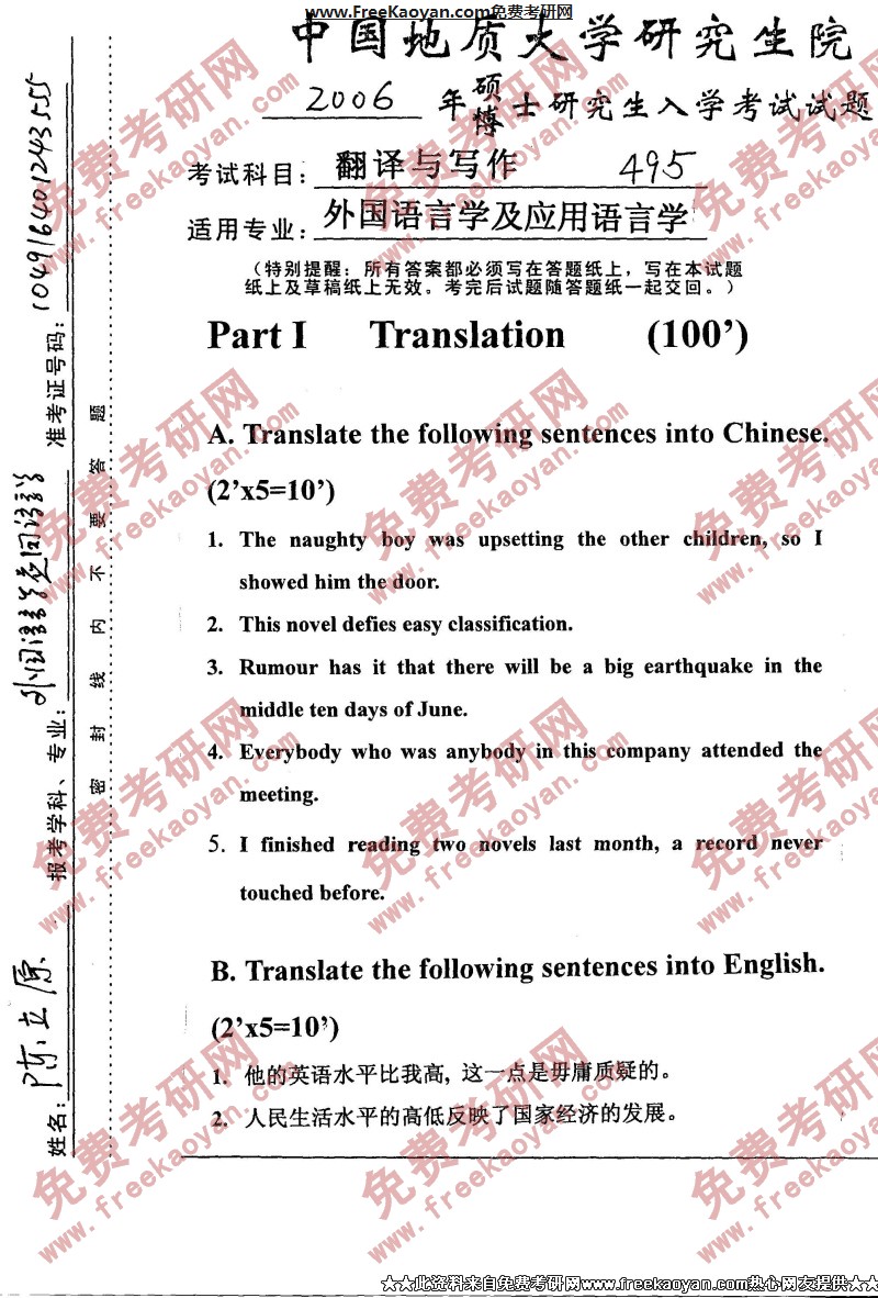 中国地质大学(武汉)2006年半岛在线注册真题-翻译与写作
