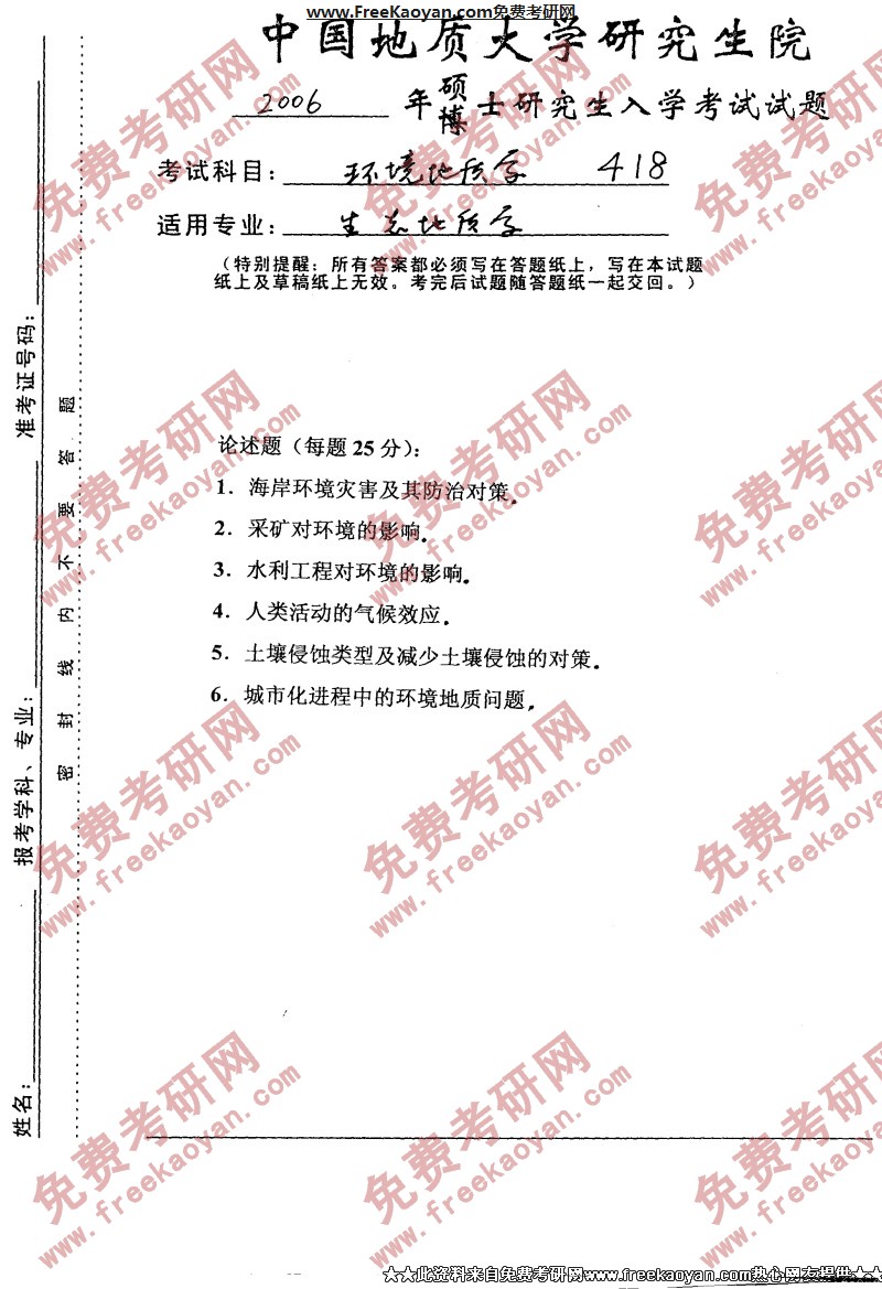 中国地质大学(武汉)2006年半岛在线注册真题-环境地址学