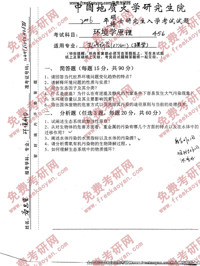 专业课半岛在线注册经验 本站小编 FreeKaoyan 2018-01-23中国地质大学(武汉)2006年半岛在线注册真题-环境地址学