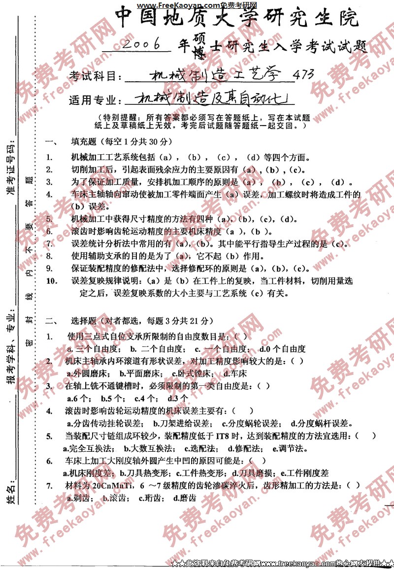 中国地质大学(武汉)2006年半岛在线注册真题-机械工艺制造学