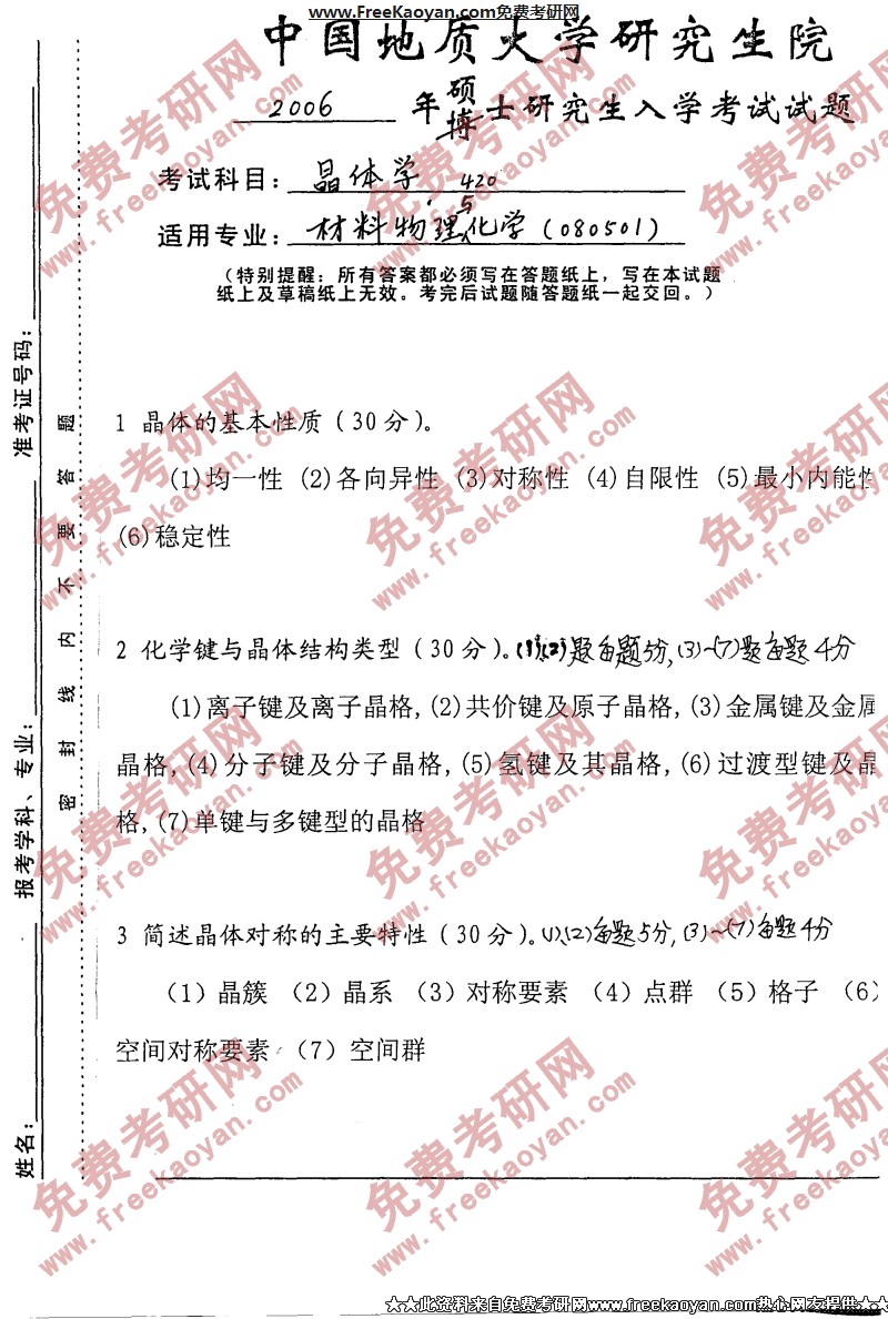 中国地质大学(武汉)2006年半岛在线注册真题-晶体学