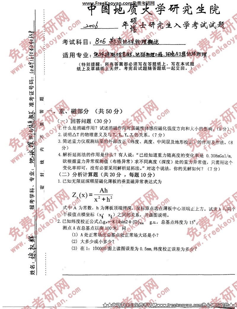专业课半岛在线注册经验 本站小编 FreeKaoyan 2018-01-23中国地质大学(武汉)2006年半岛在线注册真题-固体地球物理学概论