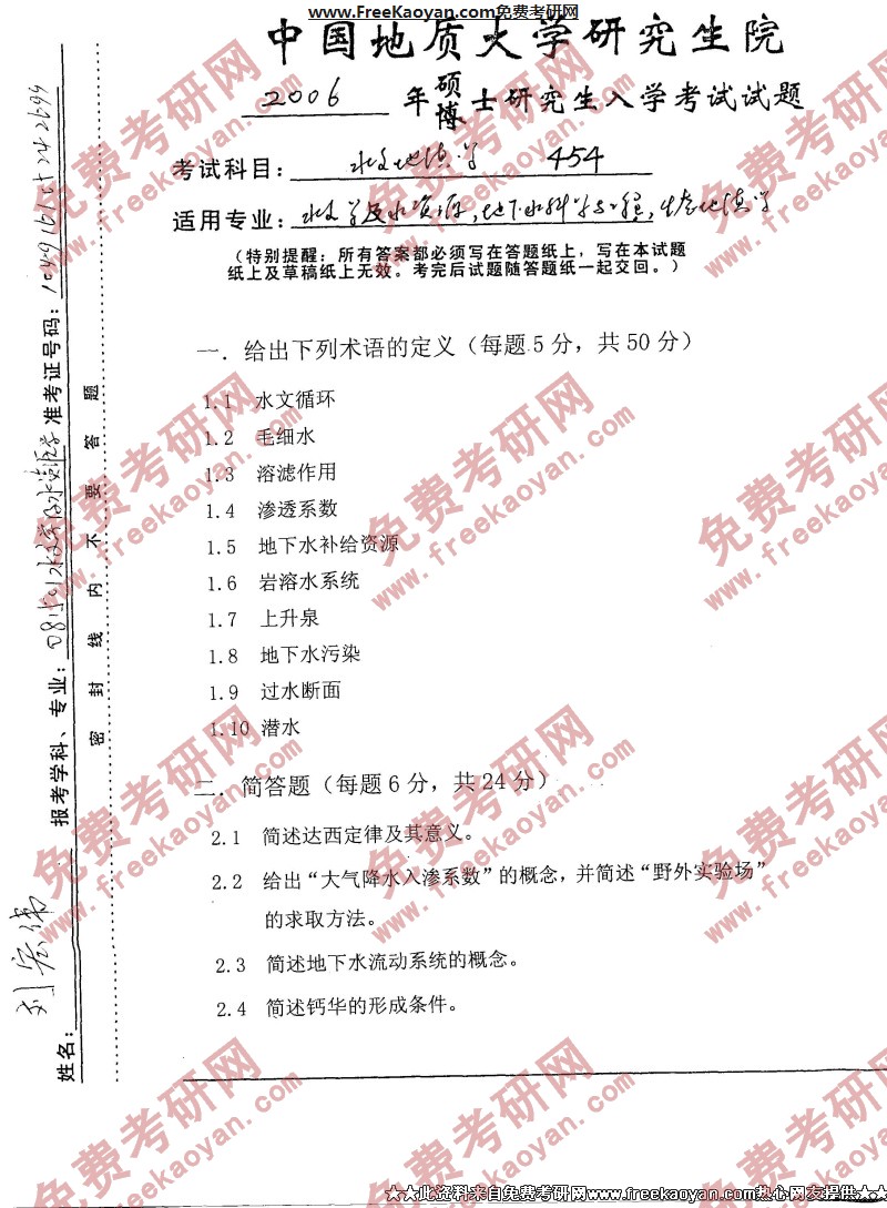 中国地质大学(武汉)2006年半岛在线注册真题-水文地质学