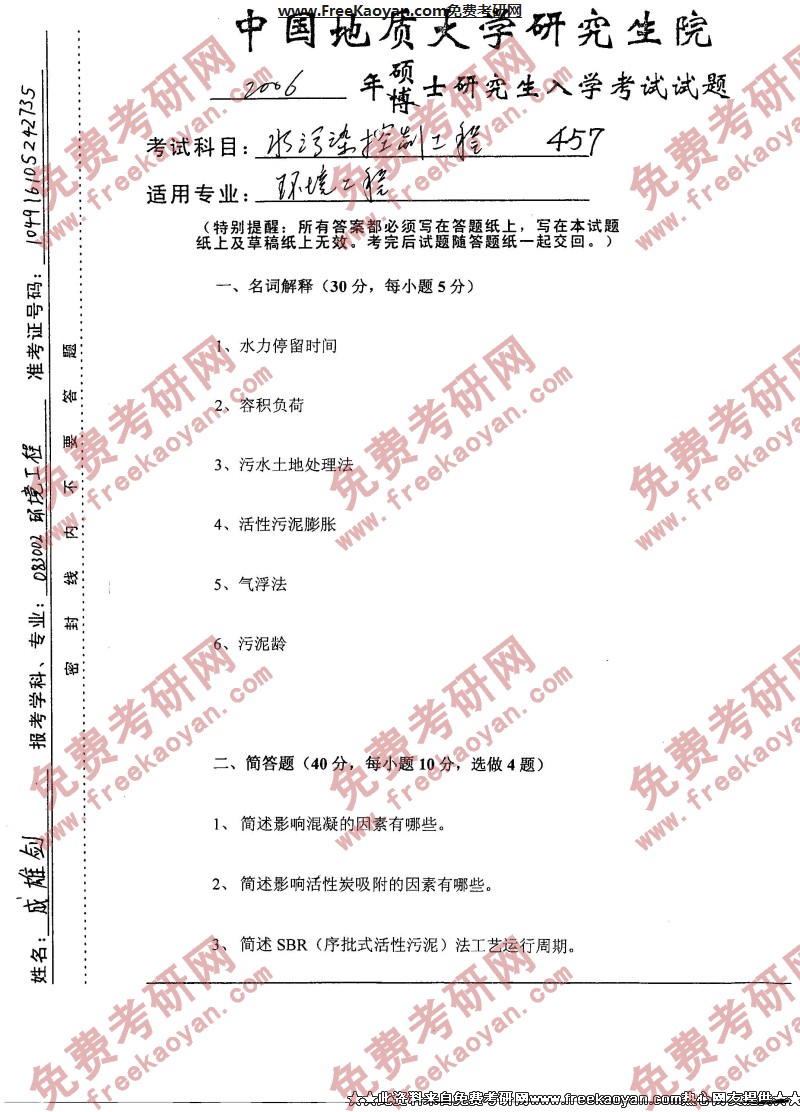 中国地质大学(武汉)2006年半岛在线注册真题-水污染控制工程