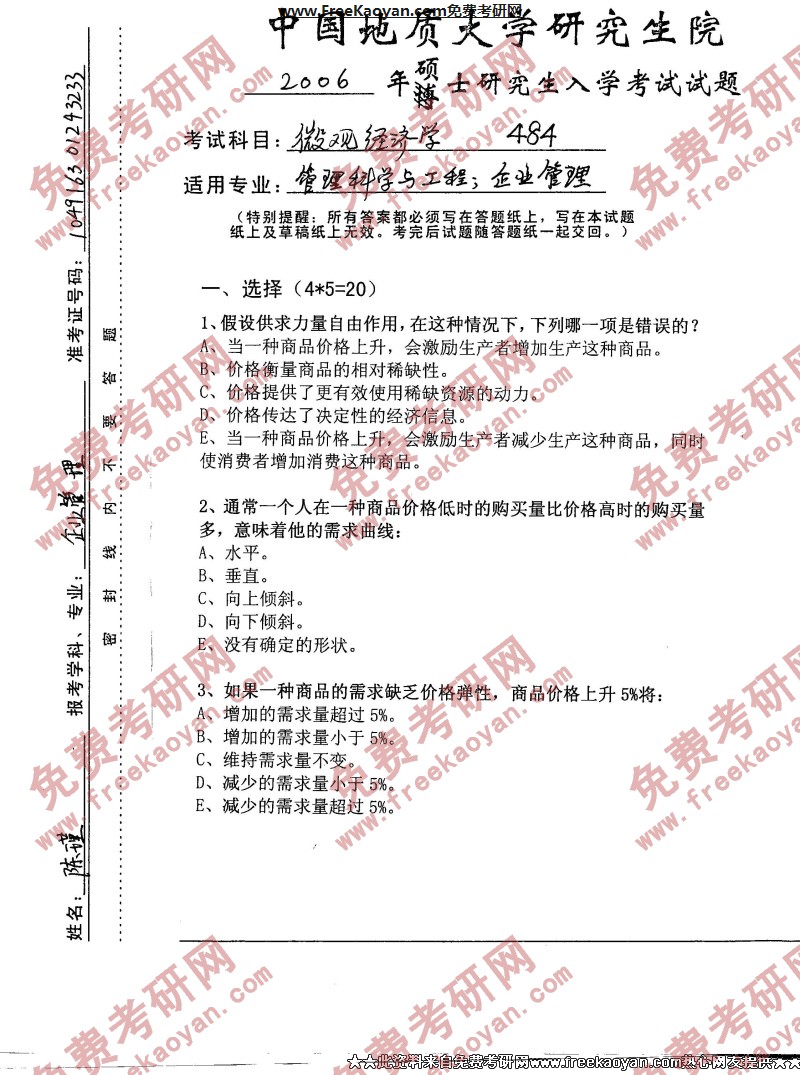 中国地质大学(武汉)2006年半岛在线注册真题-微观经济学