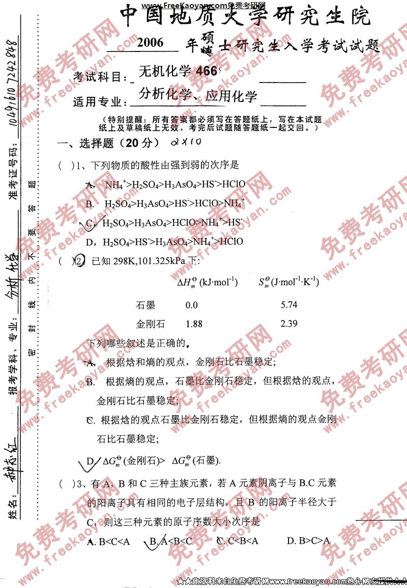 中国地质大学(武汉)2006年半岛在线注册真题-无机化学