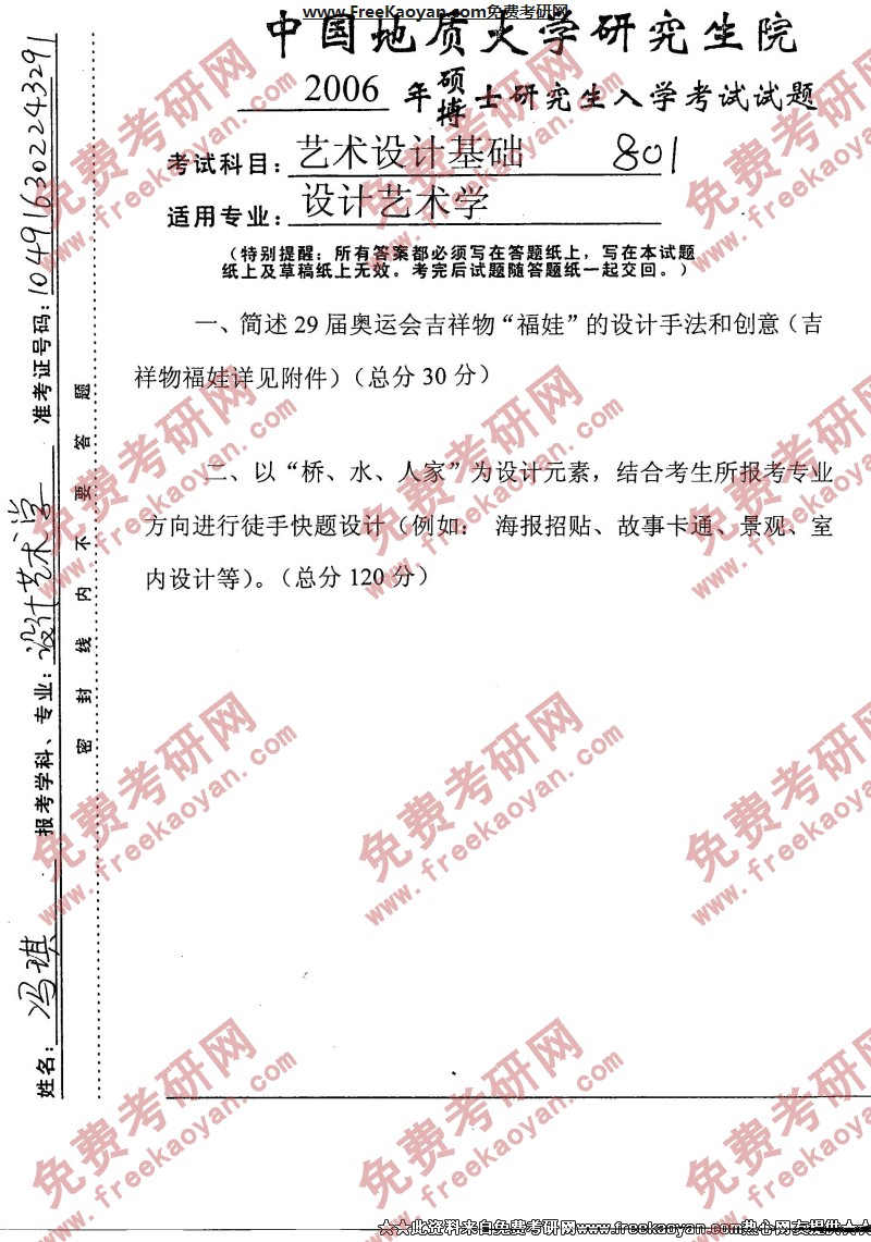 中国地质大学(武汉)2006年半岛在线注册真题-艺术设计基础