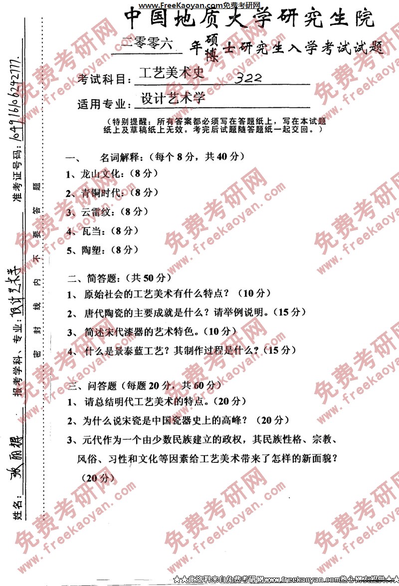 中国地质大学(武汉)2006年半岛在线注册真题-工艺美术史