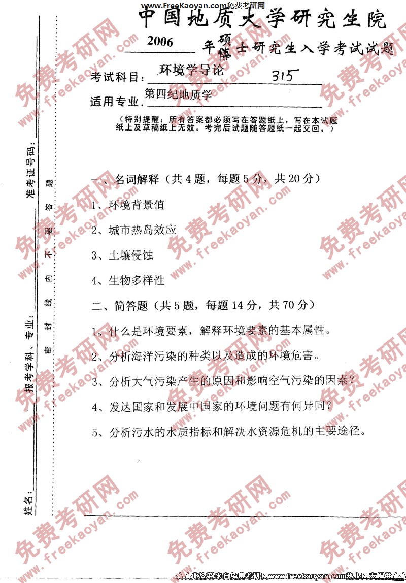 中国地质大学(武汉)2006年半岛在线注册真题-环境学导论
