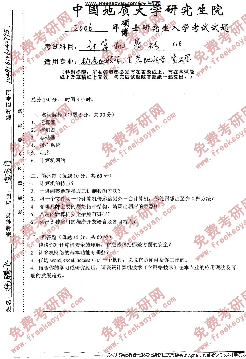 中国地质大学(武汉)2006年半岛在线注册真题-计算机基础