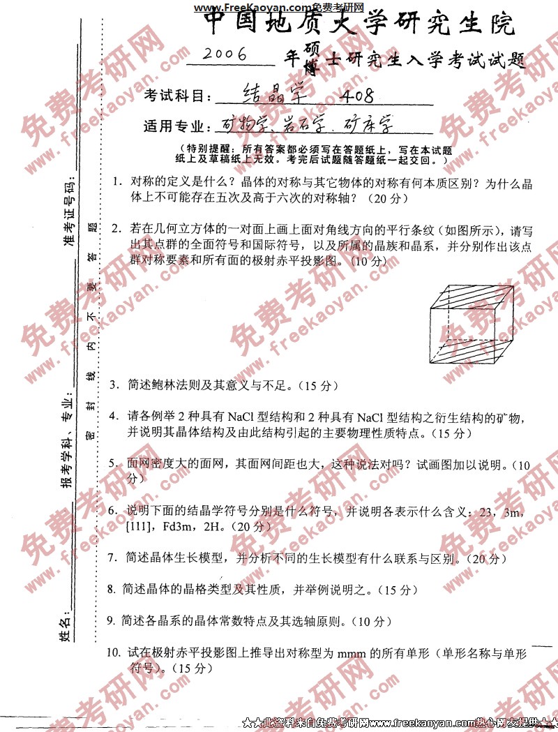 中国地质大学(武汉)2006年半岛在线注册真题-结晶学