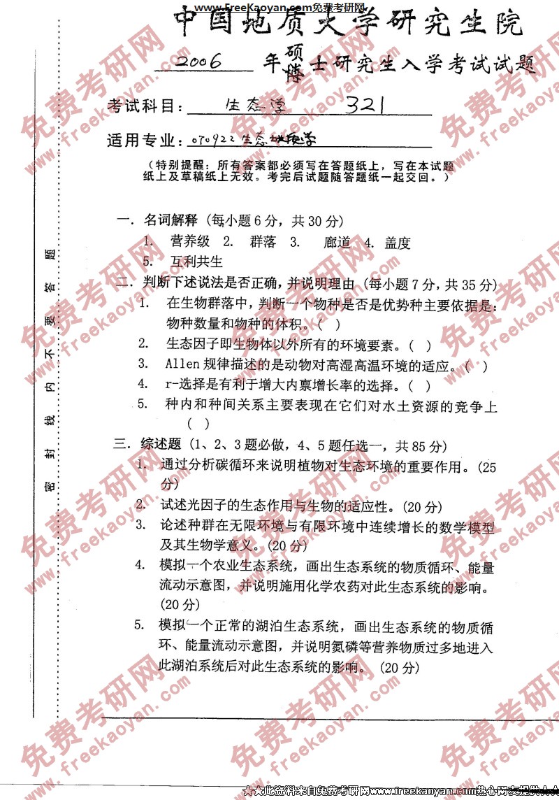 中国地质大学(武汉)2006年半岛在线注册真题-生态学