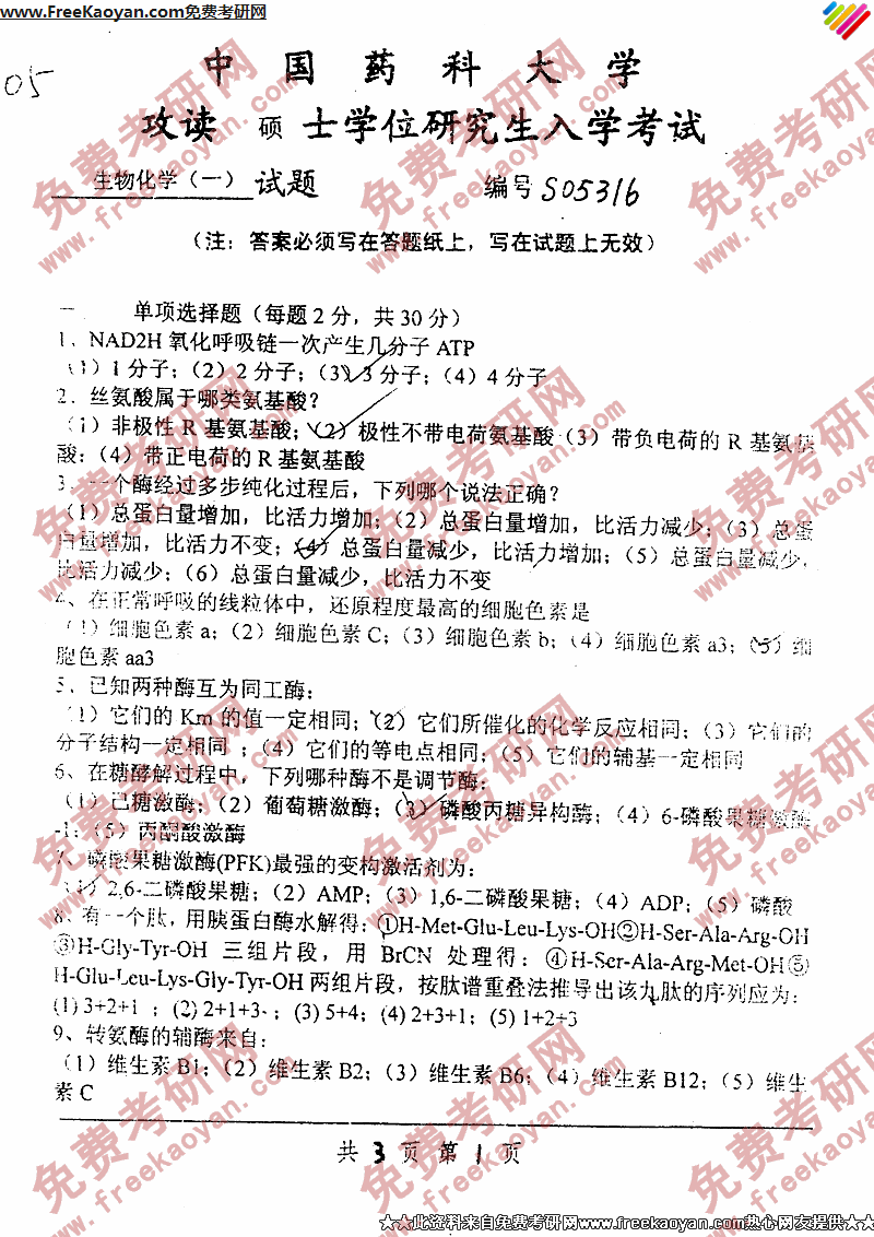 中国药科大学2005年半岛在线注册真题-生物化学(一)