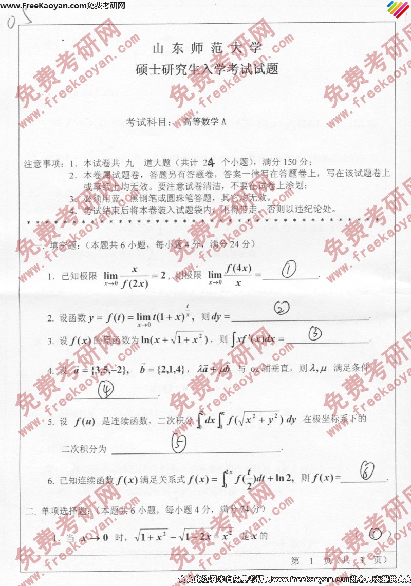 山东师范大学2005年半岛在线注册真题-高等数学A