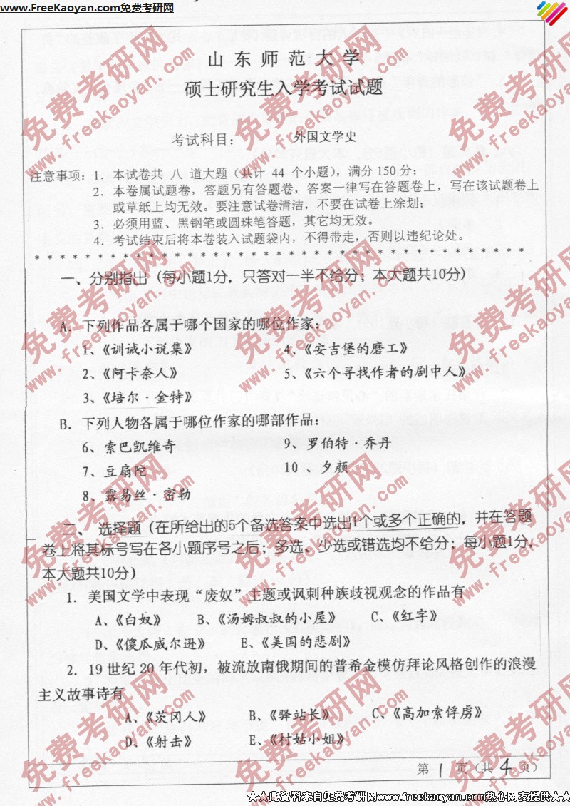 山东师范大学2005年半岛在线注册真题-外国文学史