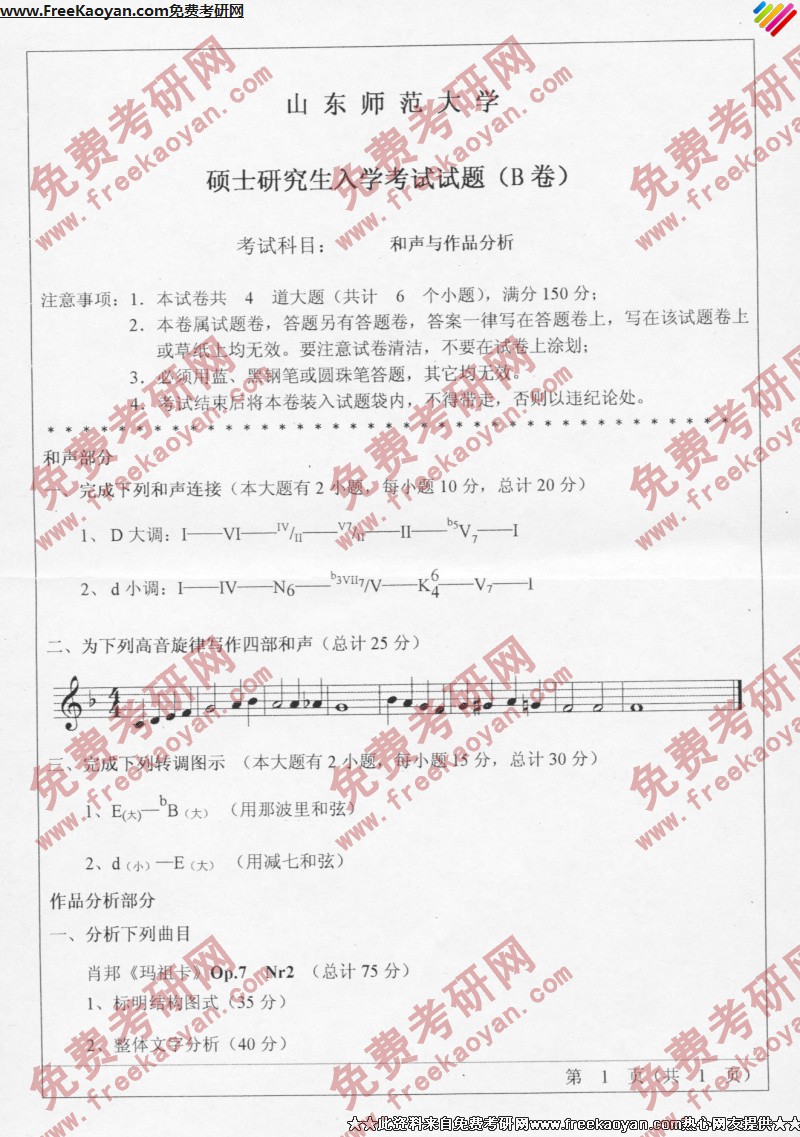 山东师范大学2005年半岛在线注册真题-作品分析与和声