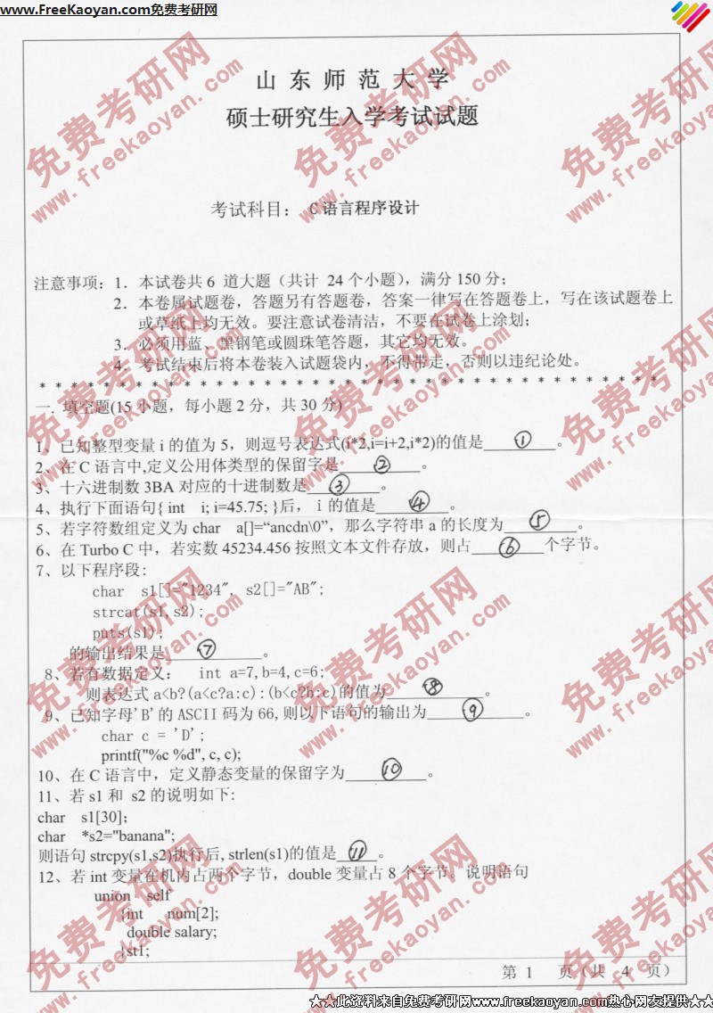 山东师范大学2006年半岛在线注册真题-C语言程序设计