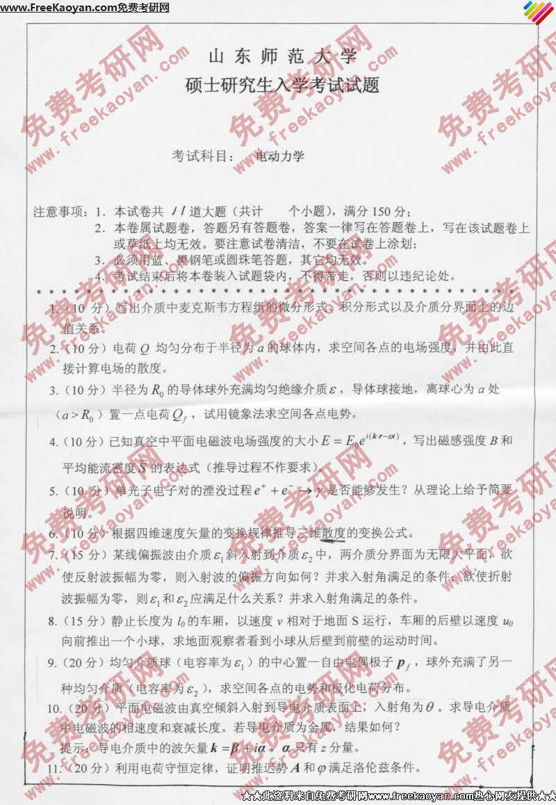 山东师范大学2006年半岛在线注册真题-电动力学