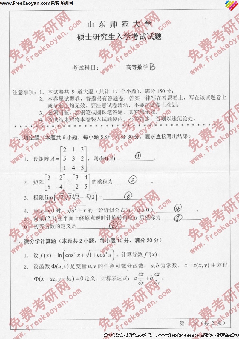 山东师范大学2006年半岛在线注册真题-高等数学B