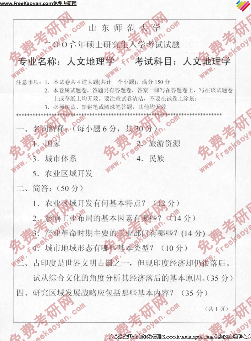 山东师范大学2006年半岛在线注册真题-人文地理学