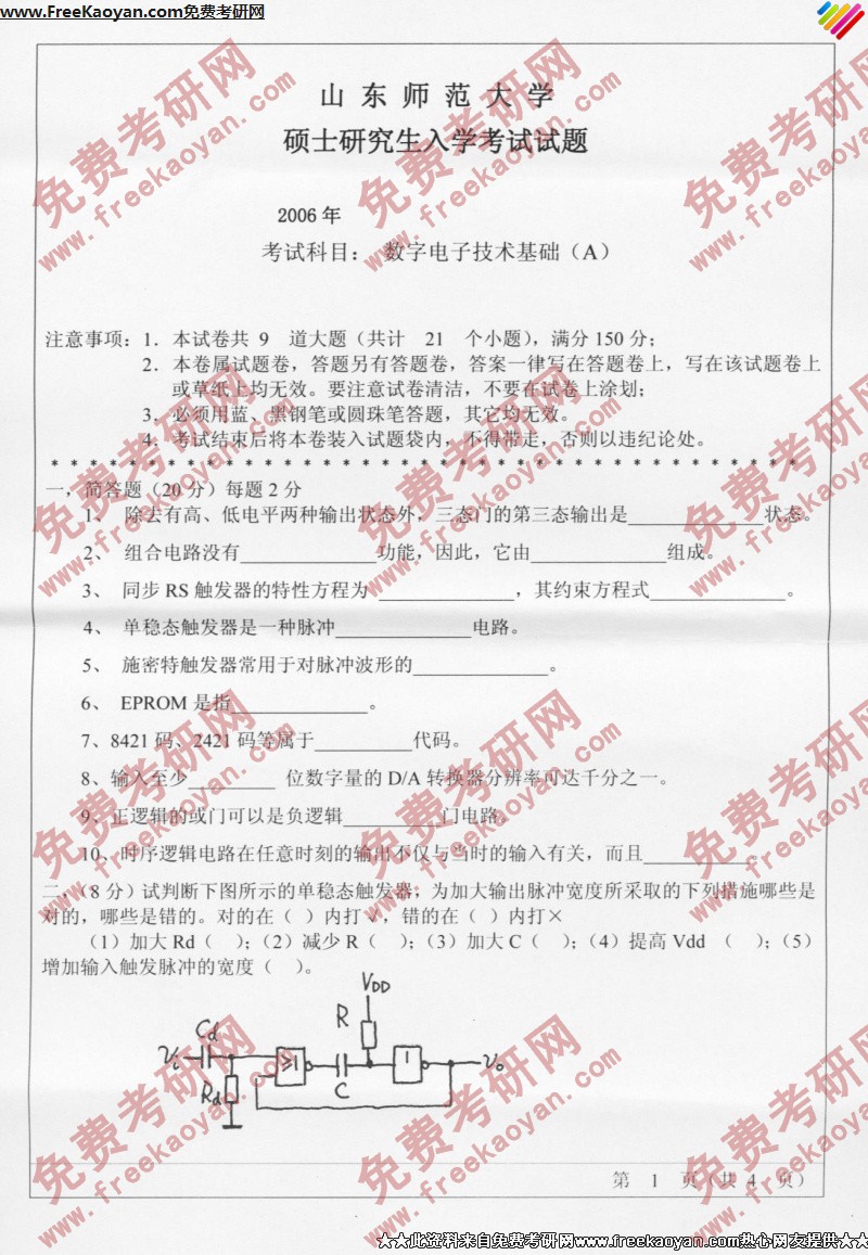 山东师范大学2006年半岛在线注册真题-数字电子技术基础