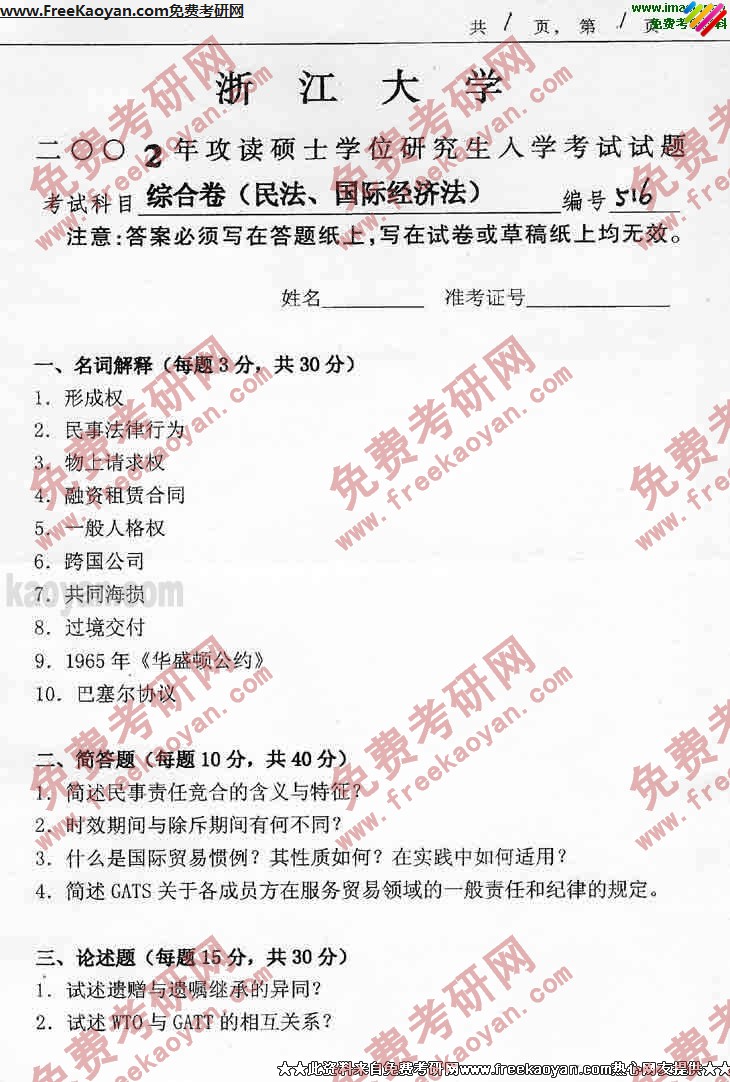 浙江大学2002年半岛在线注册真题-综合卷(民法、国际经济法)