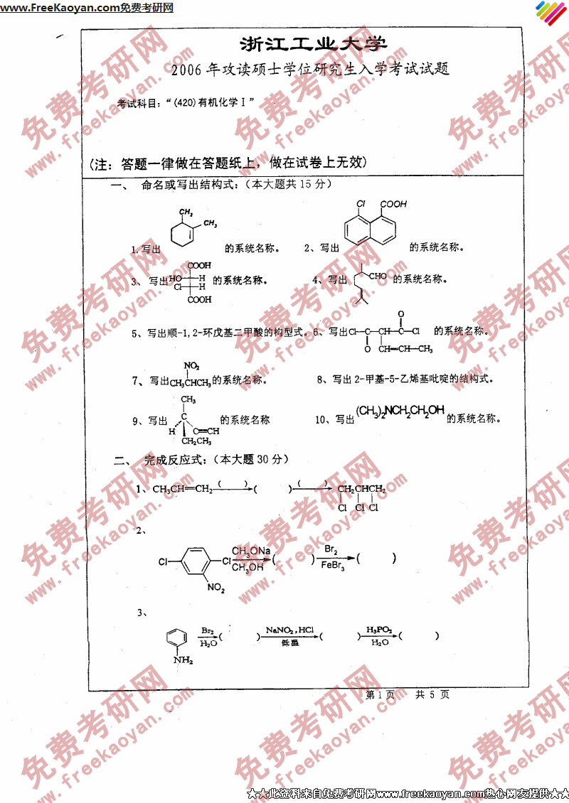 浙江工业大学2006年半岛在线注册真题-有机化学I