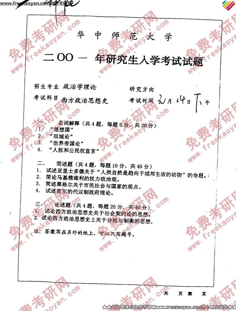 华中师范大学2001年半岛在线注册真题-西方政治思想史