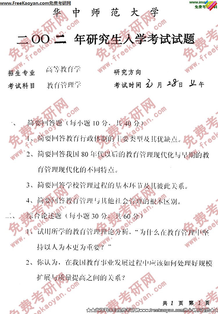 华中师范大学2002年半岛在线注册真题-教育管理学