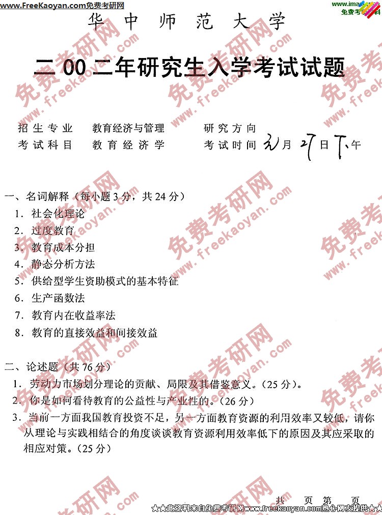 华中师范大学2002年半岛在线注册真题-教育经济学