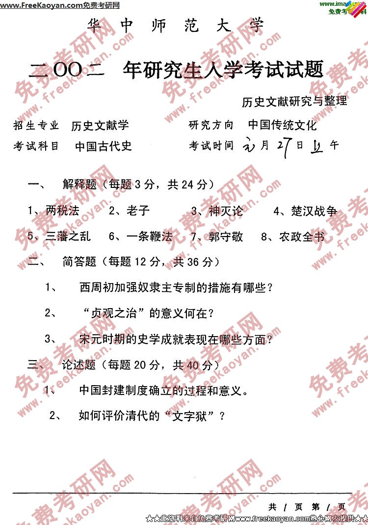 华中师范大学2002年半岛在线注册真题-中国古代史