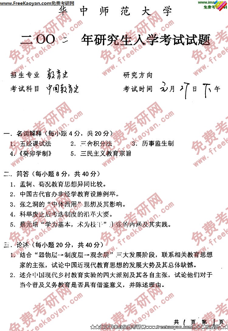 专业课半岛在线注册经验 本站小编 FreeKaoyan 2018-01-23华中师范大学2001年半岛在线注册真题-中国教育史(教育史专业)