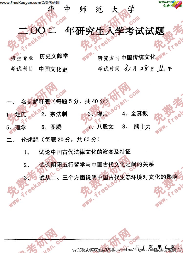 专业课半岛在线注册经验 本站小编 FreeKaoyan 2018-01-23华中师范大学2001年半岛在线注册真题-中国文化史