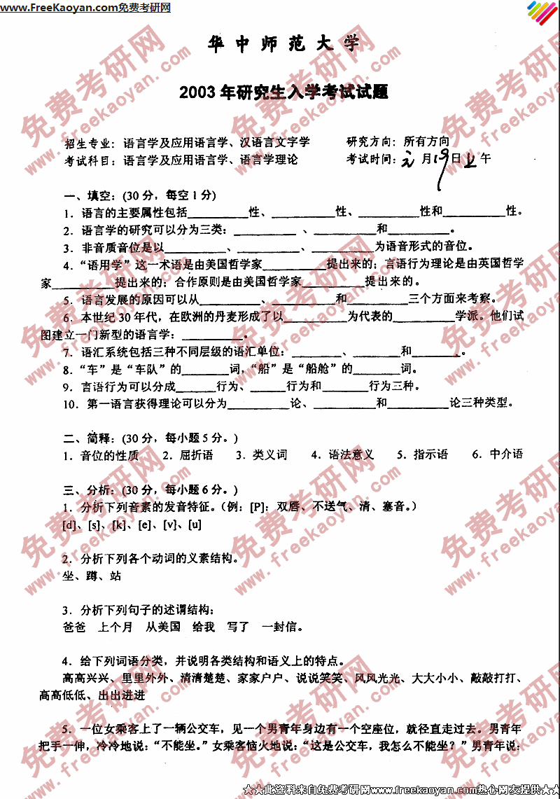 华中师范大学2003年半岛在线注册真题-语言学及应用语言学、语言学理论