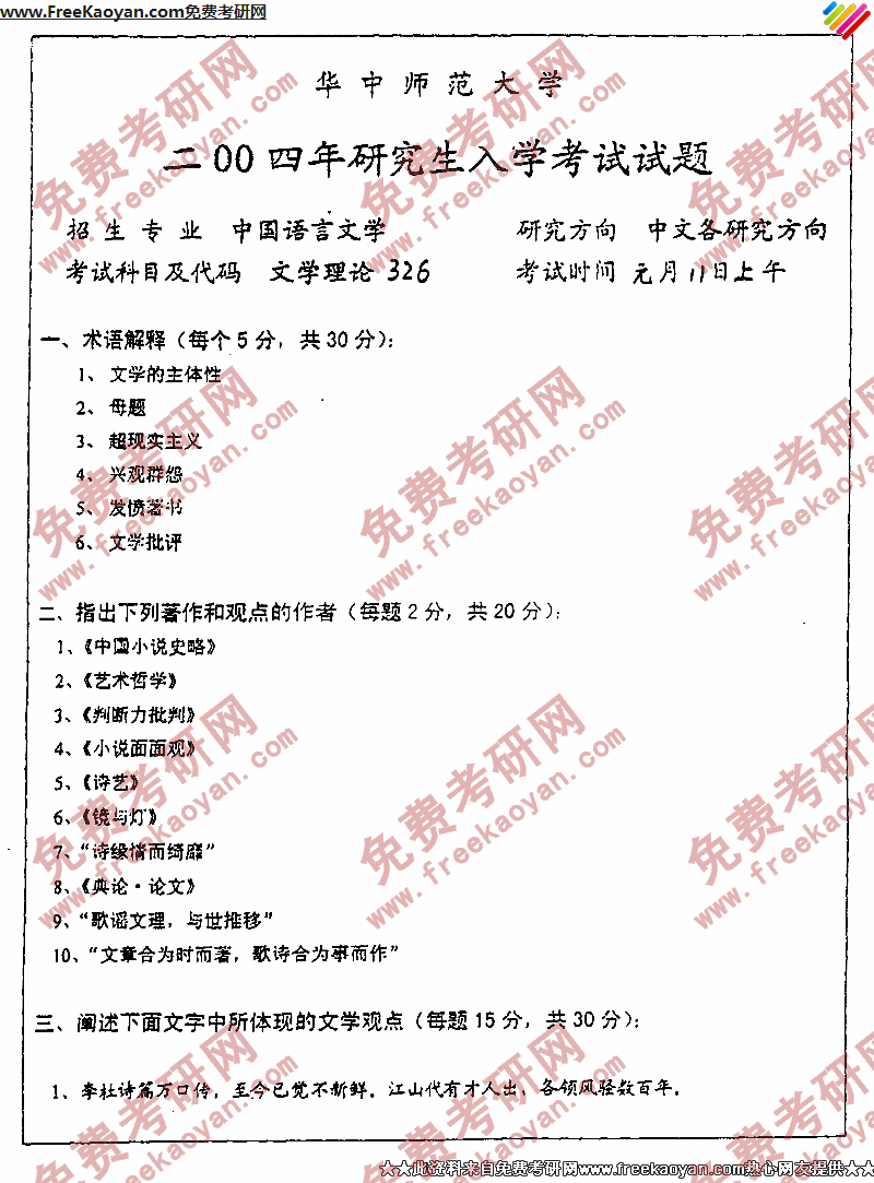 专业课半岛在线注册经验 本站小编 FreeKaoyan 2018-01-23华中师范大学2003年半岛在线注册真题-中国现当代文学(复试)
