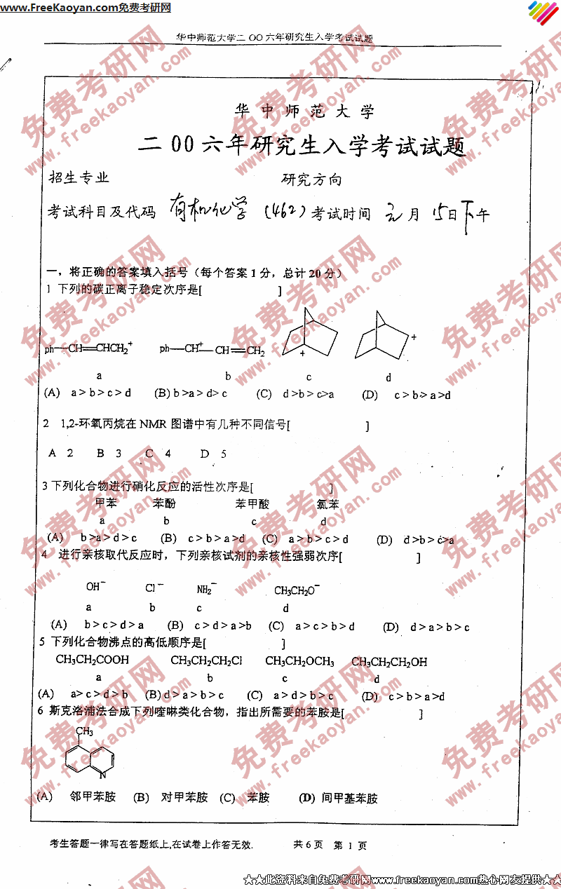 专业课半岛在线注册经验 本站小编 FreeKaoyan 2018-01-23华中师范大学2005年半岛在线注册真题-有机化学