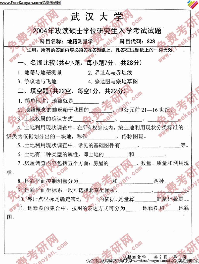 武汉大学2004年半岛在线注册真题-地籍测量学