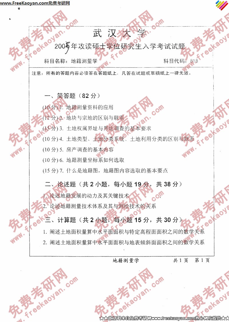 武汉大学2005年半岛在线注册真题-地籍测量学