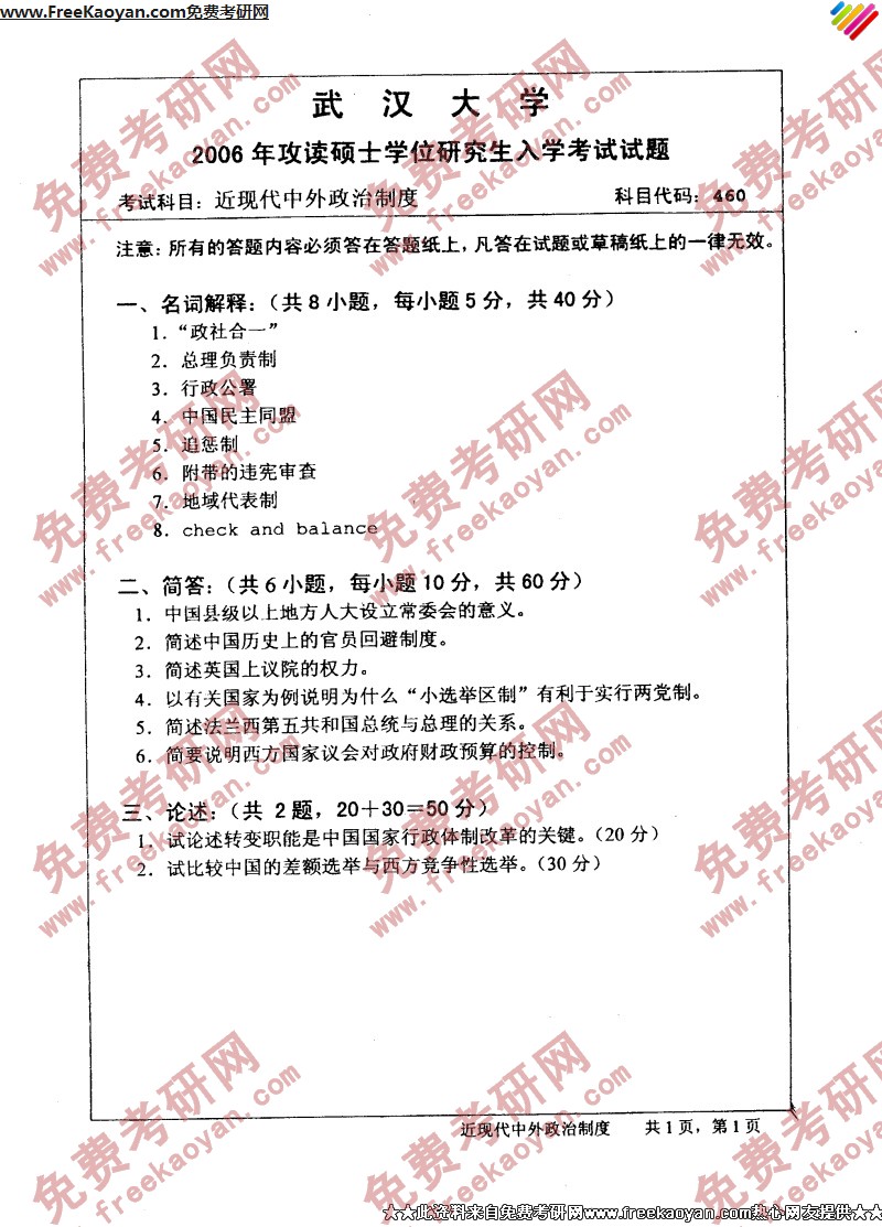 武汉大学2006年半岛在线注册真题-近现代中外政治制度
