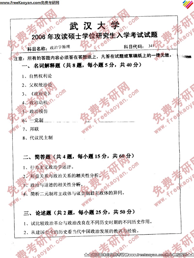专业课半岛在线注册经验 本站小编 FreeKaoyan 2018-01-23武汉大学2006年半岛在线注册真题-近现代中外政治制度