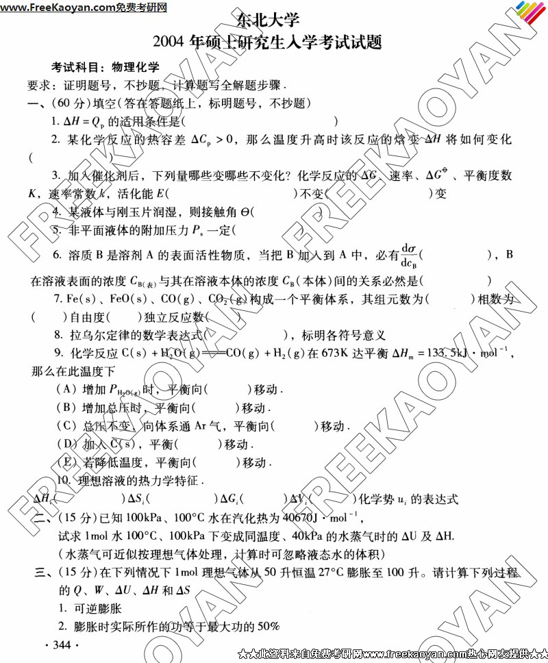 专业课半岛在线注册经验 本站小编 FreeKaoyan 2018-01-23东北大学2004年半岛在线注册真题-大学化学B