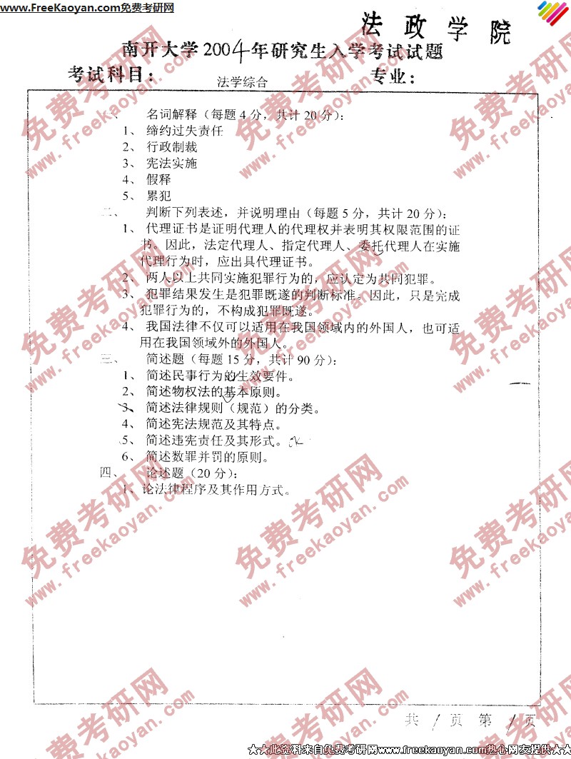 南开大学2004年半岛在线注册真题-法学综合