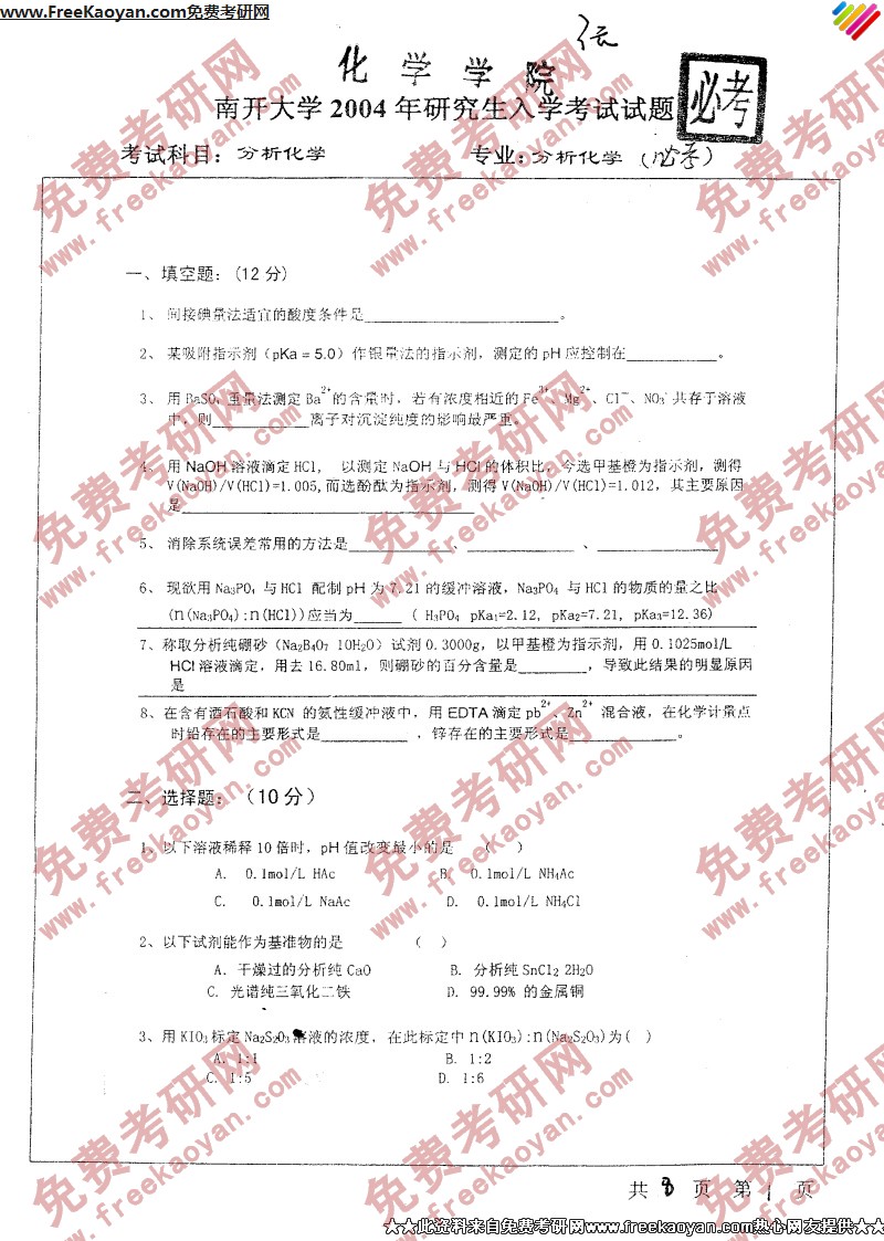 南开大学2004年半岛在线注册真题-分析化学