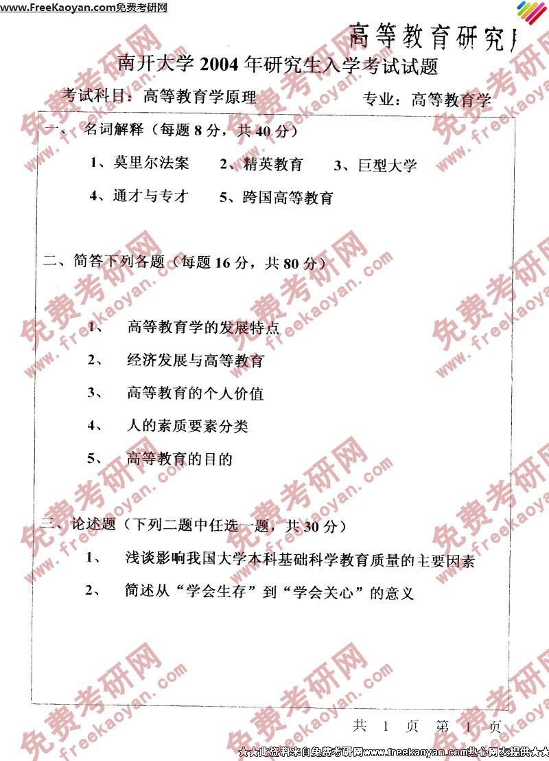 专业课半岛在线注册经验 本站小编 FreeKaoyan 2018-01-23南开大学2004年半岛在线注册真题-高等教育管理