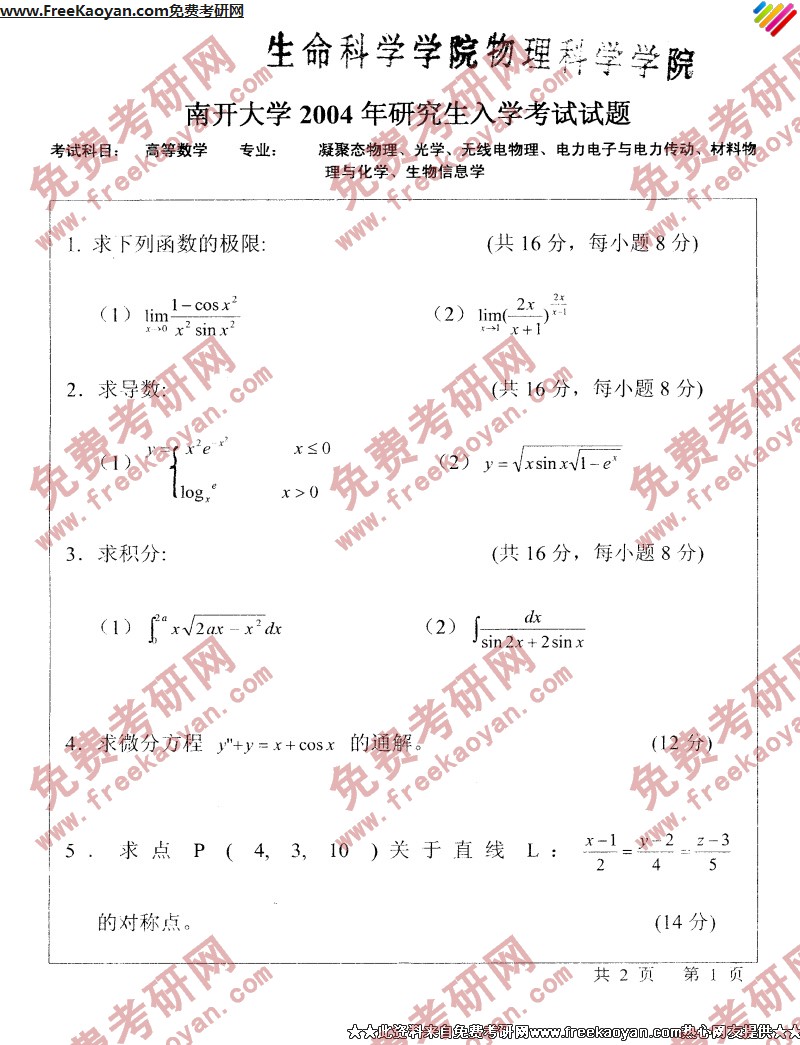 南开大学2004年半岛在线注册真题-高等数学