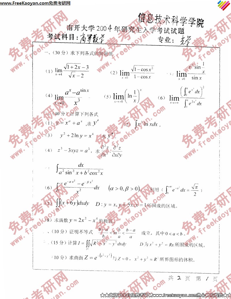 专业课半岛在线注册经验 本站小编 FreeKaoyan 2018-01-23南开大学2004年半岛在线注册真题-高等数学