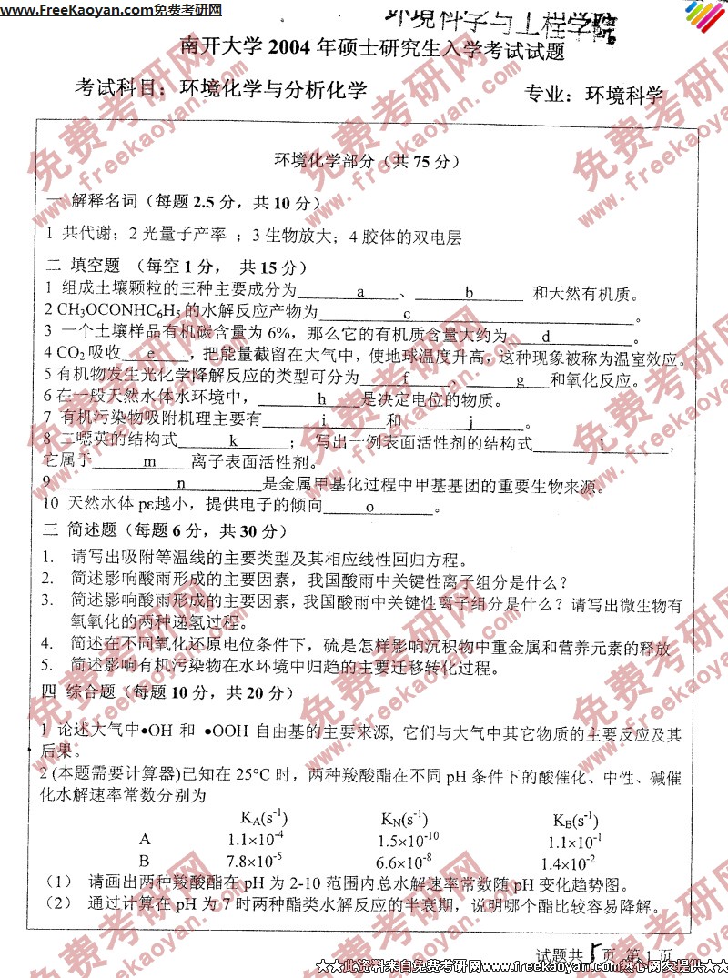 南开大学2004年半岛在线注册真题-环境化学与分析化学