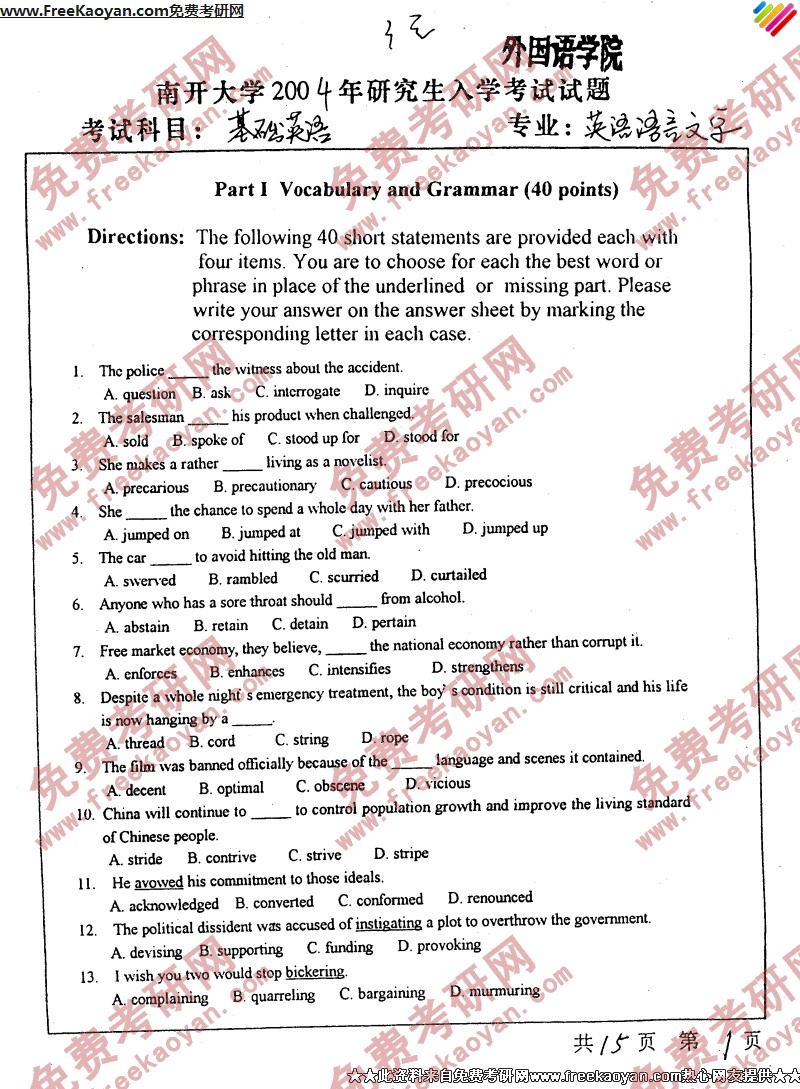 南开大学2004年半岛在线注册真题-基础英语