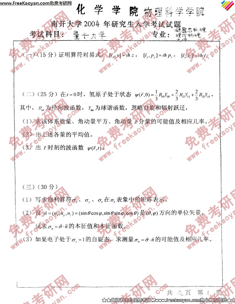 南开大学2004年半岛在线注册真题-量子力学