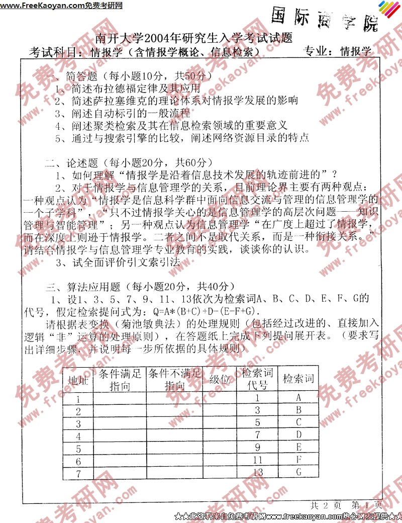 南开大学2004年半岛在线注册真题-情报学(含情报学概论信息检索)